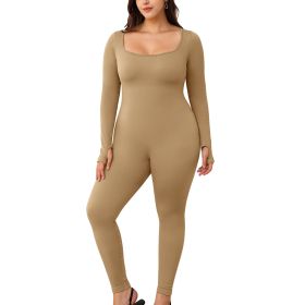 Womens Yoga Jumpsuits Workout Ribbed Long Sleeve Sport Jumpsuits (Color: KhakiBeige, size: S)
