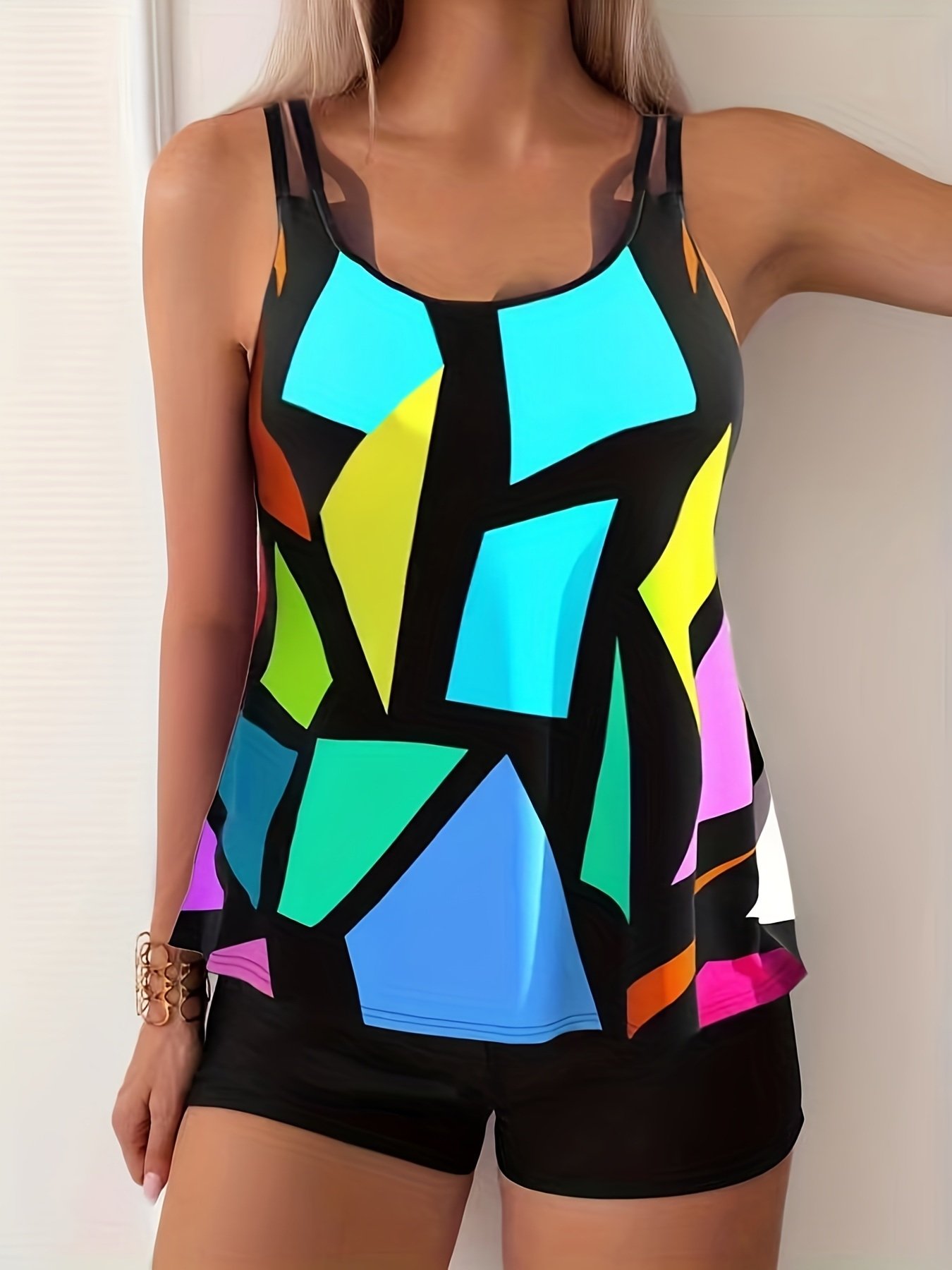 Geometric Pattern Multicolored Tankini Sets, Round Neck Boxer Short Bottom Two Pieces Swimsuit, Women's Swimwear & Clothing